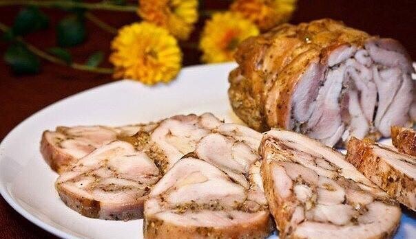 Ингредиенты: Куриное филе - 1 кг Чеснок - 7 гр Паприка - 1 ч. л Базилик - 1/4 ч. л Орегано - 1/4 ч. л Горчица - 1 ч. л Соль, перец - по вкусу Приготовление: Куриное филе промываем. В ступке измельчаем перец горошком, добавляем горчицу, чеснок и перетираем в пасту. Выкладываем подготовленные большие куски в миску, добавляем соль, паприку, подготовленную пасту, базилик, орегано и 1 ст.л. масла. Перемешиваем. Кусок бумаги для выпечки 40 х 40 сбрызгиваем маслом и выкладываем подготовленные куриные кусочки посередине. Плотно сворачиваем бумагу с курицей в рулет и закрепляем концы. В жаровню наливаем 1 стакан воды, добавляем 1-2 зубчика чеснока и выкладываем подготовленный рулет. Запекаем куриную ветчину в духовке около одного часа. Готовую ароматную курочку вынимаем, остужаем на столе около 20 минут. Отправляем рулет в холодильник на 30 минут. Затем освобождаем от бумаги, нарезаем и подаем. Приятного аппетита! #рецепты из курицы #рулет куриный