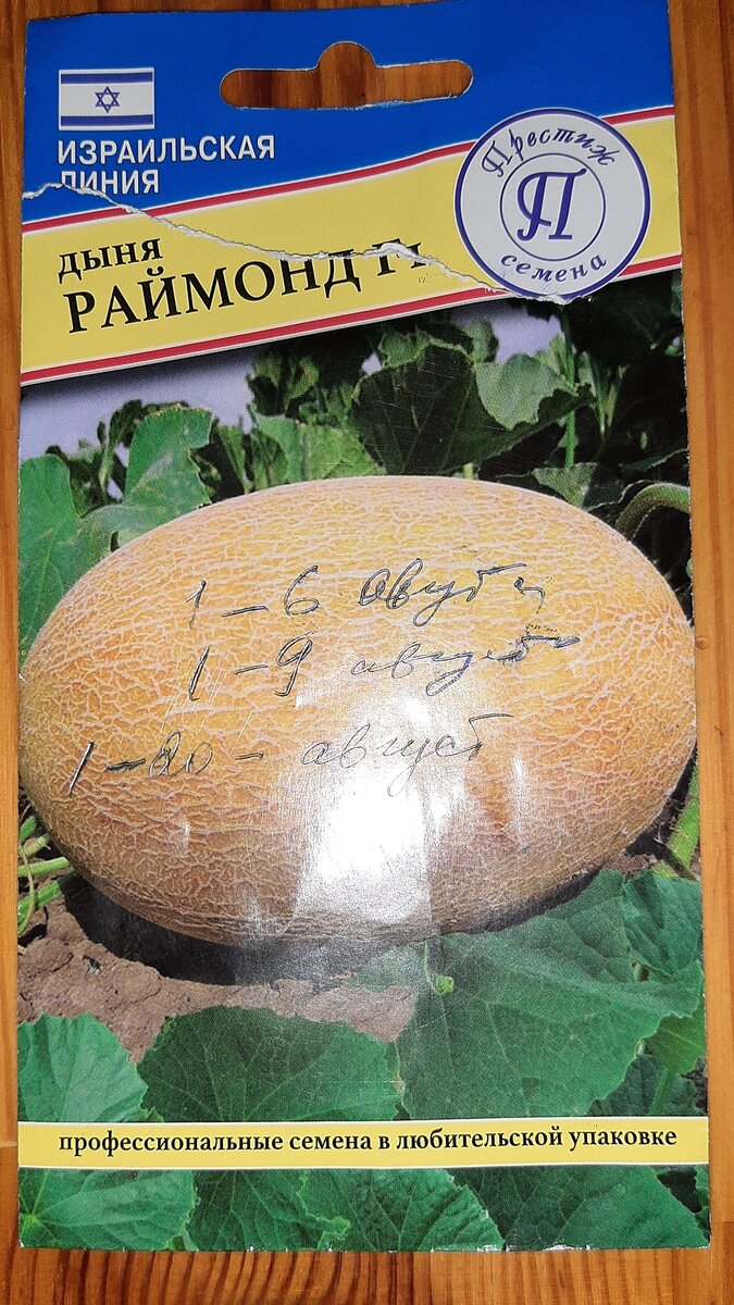 Дыня Раймонд относится к среднераннему сорту дыни. Раймонд вырастила в теплице. Посев семян был осуществлен 10 мая, первый сбор 9 августа. По вкусу дыня не уступает покупным. По виду напоминает «торпеду». Очень сочная, вкусная, сладкая. Масса первой дыни составила 6,4 кг. Последующие плоды дыни немного меньше. Дыни меняли цвет с зеленого на желтый в течение двух дней, после чего в теплице появлялся очень сильный дынный запах. Именно запах плода и явился для меня отправной точкой сбора урожая. Плоды получились крупные, безупречной овальной формы. Данный сорт (гибрид дыни ананасового типа) имеет только положительные отзывы по выращиванию как среди новичков-огородников к которым я отношу себя, так и среди агрономов с опытом. Зрелая Раймонд F1 характеризуется крупным размером, овальной формой. Кожа плода имеет ярко-желтый сетчатый окрас, на тактильность шершавая, тугая. Мякоть зрелого плода имеет хрустящий звук, среднюю сочность, сладко-медовый вкус, бежево-жёлтый окрас. Листики средне-