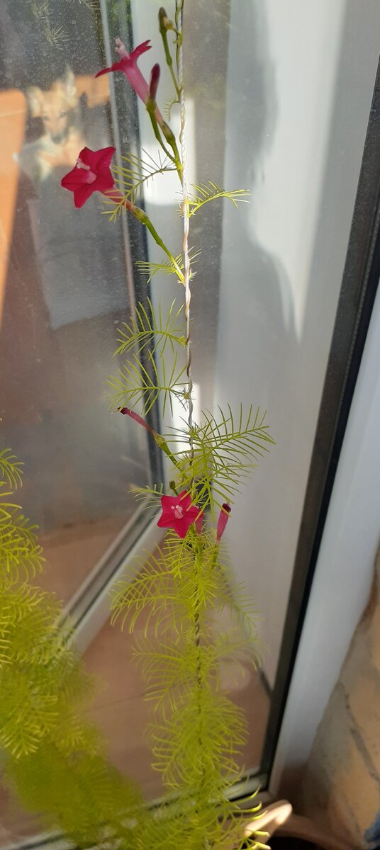 Мелкие красные звёздочки расцвели ранним утром, росла вьюн трава, а потом появились они - красные огоньки! Семена привез супруг из Кыргызстана, сказал хороший щит от солнца. Травка выросла и обьвила окно, но когда зацвели цветочки это чудо! Незнаю как называются, может кто подскажет?