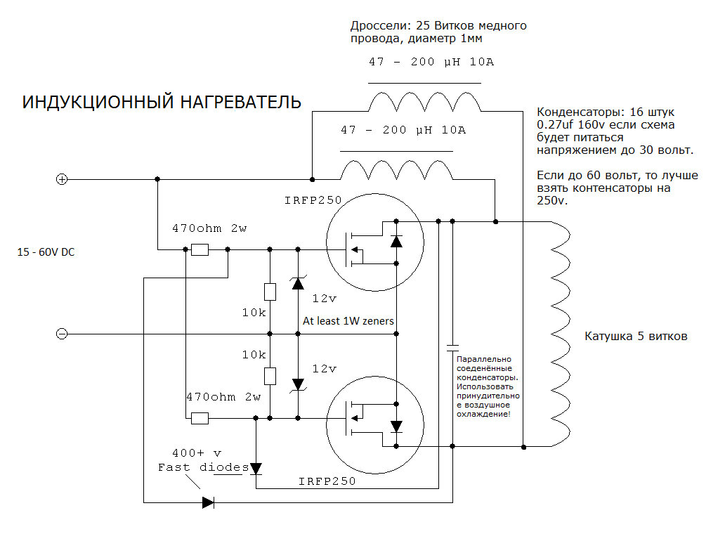 Схема индукционного нагревателя на 500 Ватт, который можно сделать своими руками! В интернете множество подобных схем, но интерес к ним пропадает, так как в основном они или не работают или работают но не так как хотелось бы. Данная схема индукционного нагревателя полностью рабочая, проверенная, а главное, не сложная, думаю вы оцените! Схема индукционного нагревателя: Компоненты и катушка: Рабочая катушка содержит 5 витков, для намотки была использована медная трубка диаметром около 1 см, но можно и меньше. Такой диаметр был выбран не случайно, через трубку подаётся вода для охлаждения катушки и транзисторов. Транзисторы ставил IRFP150 так как IRFP250 под рукой не оказалось. Конденсаторы плёночные 0,27 мкФ 160 вольт, но можно поставить 0,33 мкФ и выше, если первые найти не получится. Обратите внимание, что схему можно питать напряжением до 60 вольт, но в этом случае, рекомендуется ставить конденсаторы на напряжение 250 вольт. Если схема будет питаться напряжением до 30 вольт, то на 15