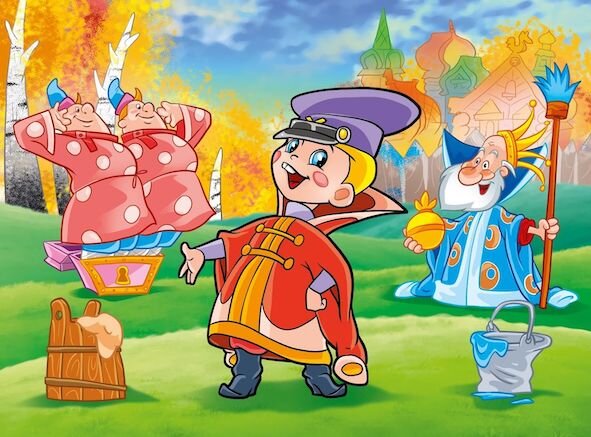 Вовка, книги, Царь, слуги-стражники, Старуха, Старик, Золотая рыбка, серебряные рыбки, осьминожки, морские звёзды, Морской царь, Садко, морские царевны, Василисы Премудрые, Молодцы из ларца, Яблоня, Речка, Печка, гуси-лебеди, Сестрица и Братец, внучки Бабы-Яги, грибы, Царевичи, Чудище о 9-ти головах.