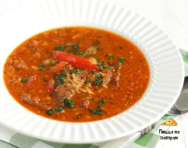 Всем привет! Отвлечемся немного от солений-варений, а то что-то их стало много в последнее время на нашем канале. С наступлением сентября резко похолодало. Поэтому предлагаю согреться и приготовить вкусный, сытный суп-харчо. Это традиционный грузинский суп и готовится он из говядины. Конечно, в некоторых рецептах его готовят из свинины и даже из курицы. Но мы с вами будем следовать классическому рецепту. Поехали! Нам понадобится: Как готовим: 1. Для бульона я беру говяжью грудинку. Нарезаем на кусочки среднего размера. Кладем в кастрюлю, заливаем водой и ставим на огонь. 2. Доводим до кипения, обязательно снимаем пену. Далее убавляем огонь и варим на медленном огне в течение 40 минут. 3. Тем временем рис заливаем холодной водой и оставляем на 10 минут. 4. Займемся овощами. Помидоры и перец нарезаем кубиками. Лук чистим и мелко нарезаем. 5. На сковороде греем масло и обжариваем лучок до золотистости. Добавляем к нему перец и помидоры. Все тщательно перемешиваем, слегка обжарив