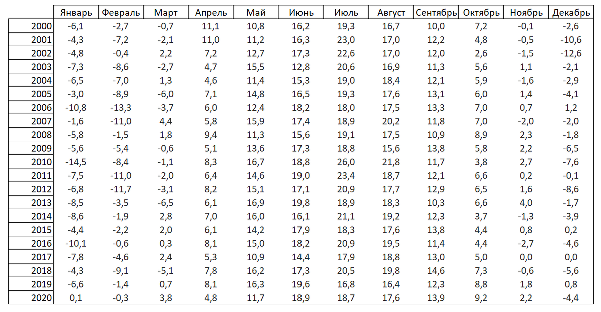 В предыдущем примере мы обсуждали способ построения графика "тепловая карта". Это весьма информативный тип визуализации. Но что, если нам захочется сделать получить не плоскую, а объемную картинку. Excel способен нам в этом помочь, т.к. имеет функционал по визуализации трехмерных поверхностей. Но также имеется и существенное ограничение, но о нем позже. Данные мы будем использовать те же, что и раньше. Это информация о среднемесячной температуре в Москве за 2000-2020 гг. В теории трехмерный график должен в предоставить визуальную информацию в легко воспринимаемом виде. Посмотрим, получится ли у нас это сделать. Выделяем весь диапазон данных (обязательно выделить названия строк и столбцов, т.к. это в дальнейшем значительно упростит работу), идем на закладку "Вставка", открываем окно создания диаграмм и выбираем тип "Поверхностная". Жмем "ОК". Получаем что-то подобное. Это не очень показательно, т.к. данные не очень хорошо видно. Встроенные функции позволяют развернуть график и подобрать