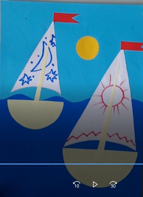 Для этой работы вам понадобятся: Лист синего картона, 1/2 листа любой светлой цв. бумаги для фона, 1/2 листа белой бумаги,1/2 листа любого цвета для кораблика и мачты, 2 шаблона круга (D-10 и D-8), красная бумага 3х1см. ( 2шт),жёлтая бумага 3х3 см., фломастеры, клей -карандаш, ножницы Возьмите голубой лист бумаги и нарисуйте простым карандашом волнистую линию Отрежем по линии волну ножницами И приклеим сверху на синий картон. На белом листочке простым карандашом нарисуем парус. Вырезать парус по линии ножницами и приклеить На белой бумаге рисуем парус по меньше. Вырезаем и приклеиваем Возьмём шаблоны кругов . Большой и маленький Простым карандашом обводим их на бумаге нужного цвета Вырезаем по контуру и разрезаем их пополам, что бы получились полукруги. Приклейте их под парусами. На красных маленьких прямоугольниках отчертим с краю угол И вырежем его ножницами. Приклеим флажки на парусники Нарисуем круг солнца на жёлтой бумаге и вырежем его. Приклеим жёлтый круг и разрисуем паруса фл