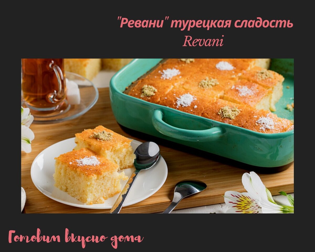 Готовый ревани нарезаю на кусочки прямо в форме и поливаю сиропом. Подаю после того, как весь сироп впитается. Приятного аппетита!