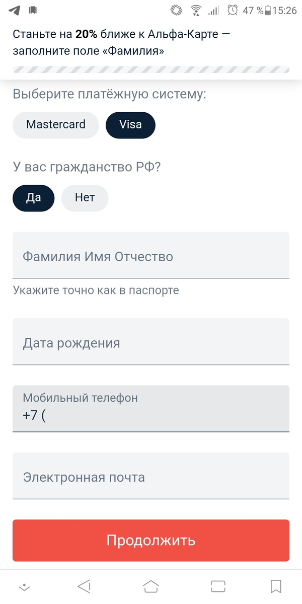 Как-то смотрел ролик на ютьюбе и увидел от блогера рекламу карты. Понятное дело я на это не обратил внимание и просто пролистал. И вот как то опять увидел рекламу той же карты. Тип дебетовая все дела, но что меня привлекло это то, что если ее заказать, то можно получить 500 рублей. И пошел я значит на просторы интернета. Чтобы убедется в этом. В итоге с большими сомнениями я решаюсь ее заказать. Перехожу по ссылке https://alfa.me/vUjoBA открывается страница с информацией о карте, листаю вниз и вот оно, оформление И какое было мое удивление когда как оказалось это все что нужно было заполнить. Не нужно не паспорт не снилс. Нет окон которые открываются, перейти к следующему шагу следующему! и тд Ну и все. Вскоре мне пришло смс на телефон, что карту можно забрать. Прихожу в отделение, получаю как получают обычно карту, там же занес деньги в банкомате. И начал ждать, точнее просто скачал личный кабинет и периодический заходил в него. И вот мне аж через 14 дней приходят деньги 15 занес с