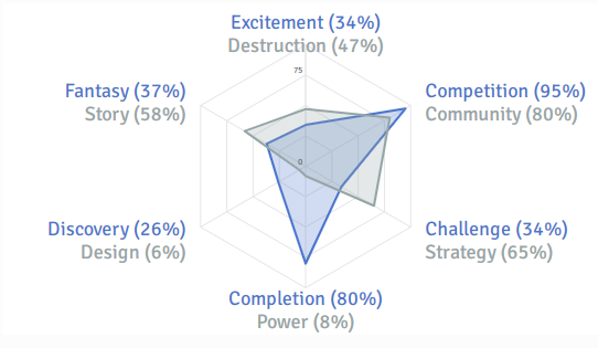 Тест можно пройти минут за 5. Вас спросят, во что вы играли в последнее время, насколько вам нравятся конкретные игровые занятия, и как часто вы делаете в игре то-то и то-то. Посчитав ваши ответы, тест нарисует ваш «геймерский портрет» (как на картинке ниже). В нем можно увидеть, насколько вам важны: экшн (азарт, разрушение), общение (соревнование, дружба), мастерство (вызов, стратегия), достижения (завершение, сила), творчество (открытие, созидание) и погружение (фантазии, история).