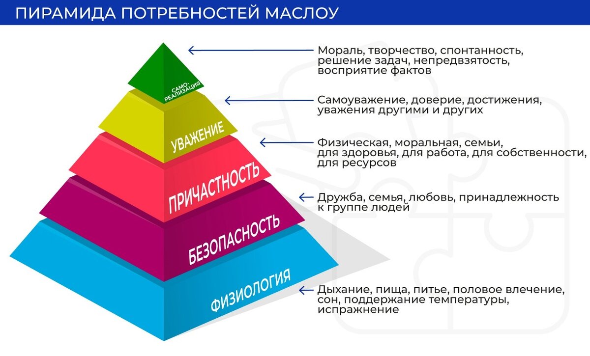 Помните психолога Маслоу, который нарисовал пирамиду мотиваций и разграничил её на несколько этапов, что побуждает человека к действию. Все хоть раз её видели, но повторю это изображение.