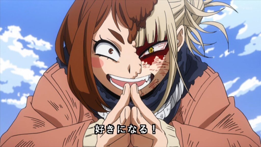 В "Моей геройской академии" есть множество классных персонажей. Я уже рассказывала о своём топе девушек и парней героев, а так же топе злодеев. Остались без моего внимания только девушки злодейки. К сожалению, в МГА не так уж и много девушек занимает тёмную сторону, хотя девушек героев большое количество. Хотелось бы увидеть больше злодеек, но будем радоваться тому количеству, которое есть. 1. Химико Торга Злодейка класса А. Входит в передовой отряд Лиги Злодеев и в Паранормальный Фронт Освобождения. Из-за своей причуды, у Тоги извращённое чувство любви. Она хочет стать ближе к человеку или живому существу, которое ей нравится, поэтому пьёт его кровь. Благодаря выпитой крови, она может на время позаимствовать чужую внешность и, как нам показали в "Моей злодейской академии" (примерно последняя треть 5 сезона), даже может временно приобрести причуду этого человека. Тожа считает свою жизнь абсолютно нормальной и я не могу с этим не согласиться. Тога родилась с жаждой крови, ведь в этом