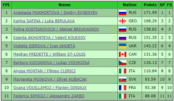 Посмотреть фотографии, результаты, протоколы, список использованной парами музыки, а также насладиться лучшими элементами произвольной программы можно в этой статье. Итоговые результаты Результаты произвольной программы: Итоговые протоколы: Фотографии (листайте): Музыкальное сопровождение, выбранное парами для произвольной программы: Лучшие элементы произвольной программы пар (по мнению судей): Лучшая подкрутка Победа в номинации "Лучшая подкрутка" уходит к украинской паре Виолетта Серова и Иван Хобта. Лучший выброс В номинации "Лучший выброс" победа достается р