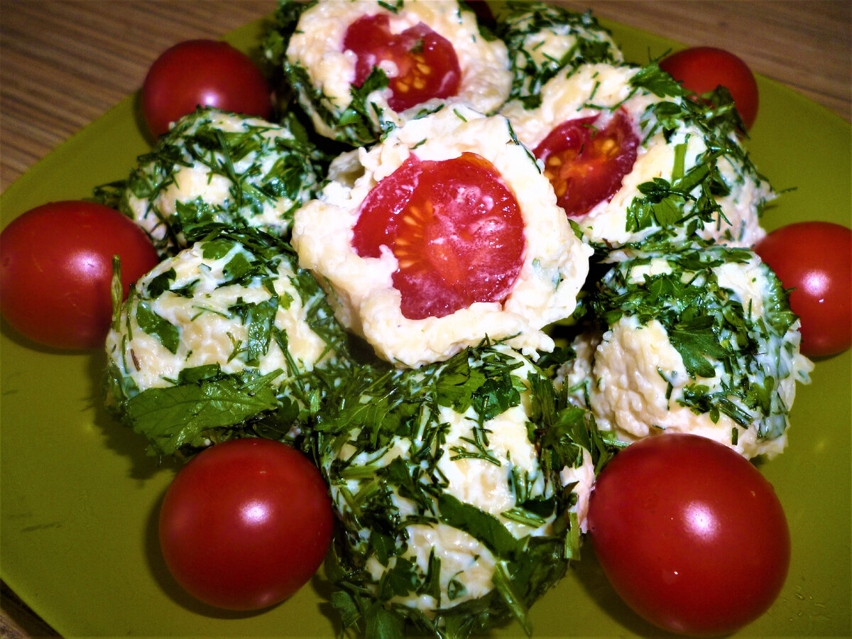 Забавная закуска "Сырные шарики" с помидорками черри.