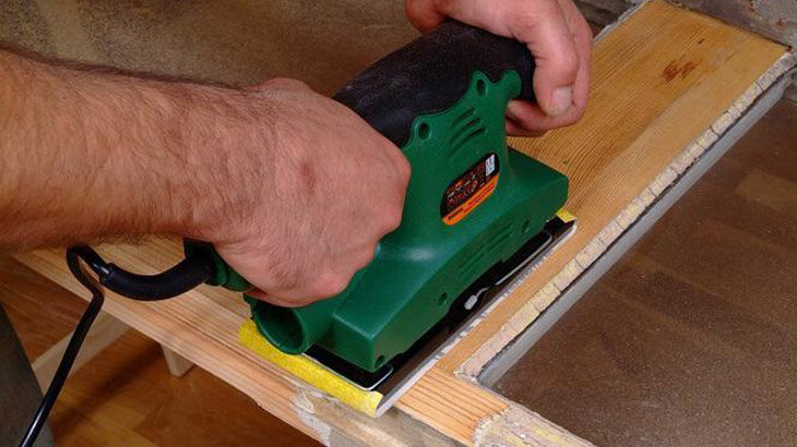 Старое покрытие снимаем, когда оно тусклое, обесцвеченное, потрескавшееся, шелушащееся, имеет большие дефекты. Делаем это грубой наждачной бумагой вручную или с помощью орбитального шлифовального станка. Мы работаем, направляя инструменты вдоль древесного зерна.
