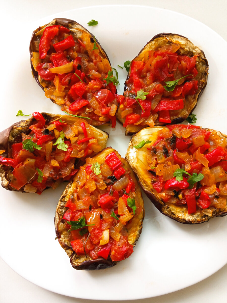 Всем большой привет! Вечером на романтический ужин с мужем решила приготовить вкусное горячее блюдо с беконом (если интересно выставлю рецепт) и долго думала, что сделать с овощами... В холодильнике остались баклажаны и я решила запечь овощную вкуснятину, ниже подробно делюсь рецептом, пошагово фиксируя, будет приятно, если вы поставите пальчик вверх и поделитесь своим мнением о рецепте. РЕЦЕПТ: Баклажаны - 4 - 5 шт. Лук - 2 шт. Чеснок - 3 зубчика Болгарский перец - 2 шт. Помидор - 1 - 2 шт. Петрушка - небольшой пучок Соль, перец по вкусу ПРИГОТОВЛЕНИЕ: Баклажаны 4 шт. разрезаю на 2 части, немного солю Выкладываю на противень и смазываю маслом Запекаю в разогретой духовке при 180 градусах 20 - 30 минут Лук 2 шт. (небольшие) нарезаю кубиками На разогретую сковороду вливаю пару столовых ложек растительного масла Выкладываю лук Чеснок 3 зубчика нарезаю мелко и отправляю к луку Обжариваю все вместе пару минут Перец болгарский 2 шт. нарезаю соломкой Выкладываю к овощам Обжариваю до м