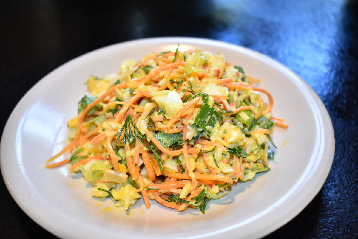 Я из тех людей которые любят разнообразие. Мои знакомые и друзья знают, что я люблю их удивлять разными блюдами, но некоторым я не изменяю. Как например этому замечательному салату Валерия. Я честно говоря, даже не помню сколько уже лет он среди моих рецептов, но является одним из любимых. Муж говорит, что в нем подкупает не только вкус, но и простота приготовления. К тому же, в его составе нет таких ингредиентов в поимках которых нужно оббегать пол города. Салат действительно вкусный, его стоит приготовить и порадовать близких! 👨🍳 Давайте уже готовить! Список продуктов я оставлю в конце статьи, для Вашего удобства. 200 г крабовых палочек нарезаем произвольными кусочками. Все ингредиенты салата отправляем в глубокую миску. Нарезаем три штуки зеленого лука и несколько веточек укропа. 4 отварных яйца мелко нарезаем. 150 г готовой корейской моркови добавляем в миску к остальным ингредиентам. Добавляем нарезанные яйца и 150 г тертого твердого сыра. Солим по своему вкусу. Добавляем майон