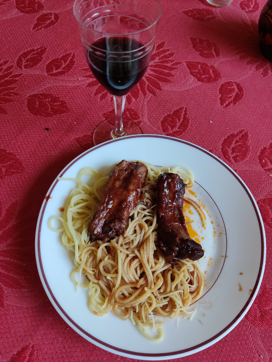 В тарелку выкладывала спагетти, сверху рёбрышки, поливала всё соусом, в котором рёбрышки запекались.