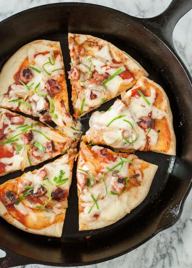 Этим рецептом со мной поделилась подруга. Бывают случаи, когда неожиданно приходят гости, а накормить нечем. Выручает такая пицца, которая готовится быстро и получается красивой с румяной корочкой. Смешать 1 стакан кефира, 1 стакан муки, 1 яйцо, 1 столовую ложку сахара, 1 чайную ложку соды, пол чайной ложки соли и вылить на сковородку. Смазать томатным соусом. Все, что нашли в холодильнике - вареное мясо, колбасу, ветчину, грибы порезать мелкими кубиками, выложить, сверху посыпать натертым сыром. Размещать 1 яйцо и 100 грамм майонеза, залить пицу. Пиццу порезать на порции и подать с чаем. Приятного аппетита.
