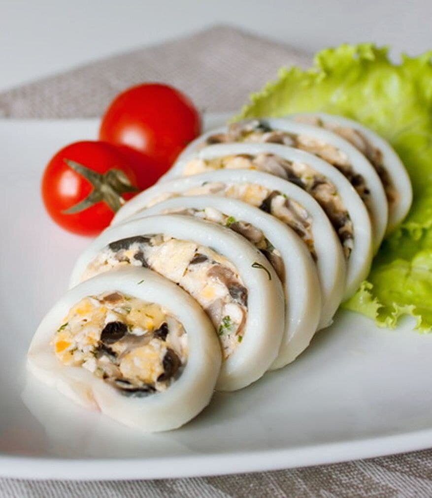 Ингредиенты 3–4 кальмара; соль — по вкусу; 300 г морского коктейля; 30–40 г риса; 50 г твёрдого сыра; 3 зубчика чеснока; 1 столовая ложка сливочного масла; 2 столовые ложки растительного масла; чёрный перец — по вкусу. Приготовление Кальмаров очистите, промойте и отварите за 30–40 секунд в слегка подсоленной воде. Остудите и сделайте на тушках по несколько продольных разрезов. Морской коктейль отварите за 5–7 минут, рис — до готовности. Сыр натрите на средней или крупной тёрке. Чеснок пропустите через пресс. В сковороде разогрейте по 1 столовой ложке сливочного и растительного масла. За пару минут обжарьте морепродукты, добавьте ⅓ чеснока, соль и перец. Готовьте ещё 1–2 минуты, выложите на тарелку и остудите. Перемешайте с рисом и сыром. Нафаршируйте тушки кальмаров и закрепите на краях зубочистками, чтобы начинка не выпадала. Выложите заготовки в смазанную растительным маслом форму и запекайте 10–15 минут при температуре 180 °С. Приятного аппетита!