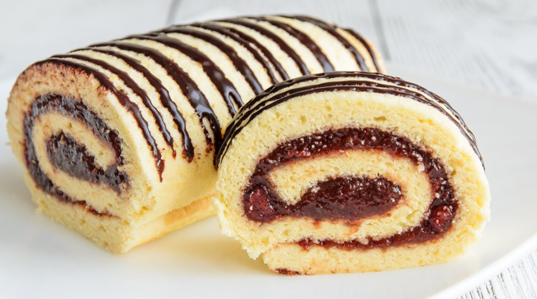 Яичная масса должна посветлеть и увеличиться в объёме, примерно, раза в 2. Выключить миксер и всыпать в яичную массу просеянную муку. Аккуратно, стараясь не осадить яичную массу, перемешать тесто лопаткой. Бисквитное тесто должно получиться воздушным, однородным и лёгким. Застелить противень (я выпекала на противне размером 30 см на 30 см) тефлоновым ковриком (или пергаментом), выложить бисквитное тесто и разровнять его. Выпекать бисквит в разогретой духовке минут 7 при температуре 190 градусов. Готовая выпечка покроется слегка золотистым цветом. Перевернуть бисквит на влажное полотенце и снять пергамент. Завернуть бисквит в полотенце и оставить на минут 20. Готовый бисквит развернуть и смазать вареньем. Свернуть бисквит, смазанный вареньем, в рулет и переложить на фольгу. Завернуть рулет в фольгу и убрать в холодильник, минимум, на час. Перед подачей