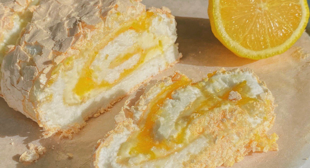 Белки охладить. В чашу влить белки, всыпать соль и лимонную кислоту. Взбить миксером в пышную пену. Не прекращая взбивать, понемногу всыпать сахар. Взбивать яичные белки на высокой скорости миксером до стойких пиков и полного растворения кристалликов сахара. Затем всыпать крахмал и перемешать на низкой скорости миксера. Белковая масса должна получиться плотной, хорошо держащей форму. Противень 30х30 см застелить пергаментной бумагой (или тефлоновым ковриком), выложить белковую массу, распределяя её лопаткой. По желанию, можно присыпать меренгу дроблёными фисташками. Выпекать корж минут 20 в разогретой духовке при температуре 190 градусов. Поверхность коржа будет слегка хрупкой. Перевернуть корж на пергамент и снять тефлоновый коврик. Оставлять корж до полного остывания не нужно, он должен быть тёплым, иначе он потрескается в процессе сворачивания! Приготовить лимонный курд заранее. С лимона снять цедру. В кастрюле соединить цедру с сахаром, перемешать и дать настояться 30 минут. Выда