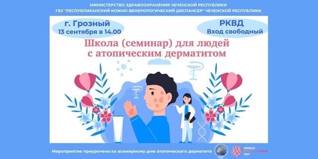 13 сентября 2021 года в г. Грозный пройдет школа для пациентов и их родственников с атопическим дерматитом на тему «Современные подходы к обследованию и лечению пациентов с атопическим дерматитом».
