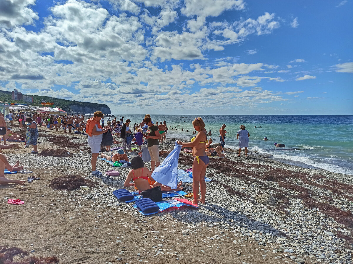Бархатный сезон пришел на смену знойному лету. И мы приехали в Дивноморское. Это село на берегу Черного моря - недалеко от Геленджика. Время в дороге между населенными пунктами - около 15 минут. В начале осени здесь по-прежнему много отдыхающих. Убедилась в этом, попав на центральный пляж. Он так и называется "Дивноморский". После дождя море немного штормило, берег был усыпан черно-зелёными водорослями, но в 10 утра найти свободное местечко уже оказалось сложновато. Кто на ковриках, кто на полотенцах, кто на надувных матрасах - отдыхающие со всей страны. Многие с детьми, в основном дошколятами. На пляже деревянные дорожки к воде, навесы, вышка спасателей, раздевалки, облепленные яркой рекламой. Раньше эти поверхности обходились без нее. Практически все покрашено в белый цвет и выглядит свежо. На входе - пункт зарядки телефонов! Я такой возле моря встречала впервые. Неплохая задумка. На пляже в основном галька. Но встречаются и небольшие песчаные участки. Вход в море довольно резкий.