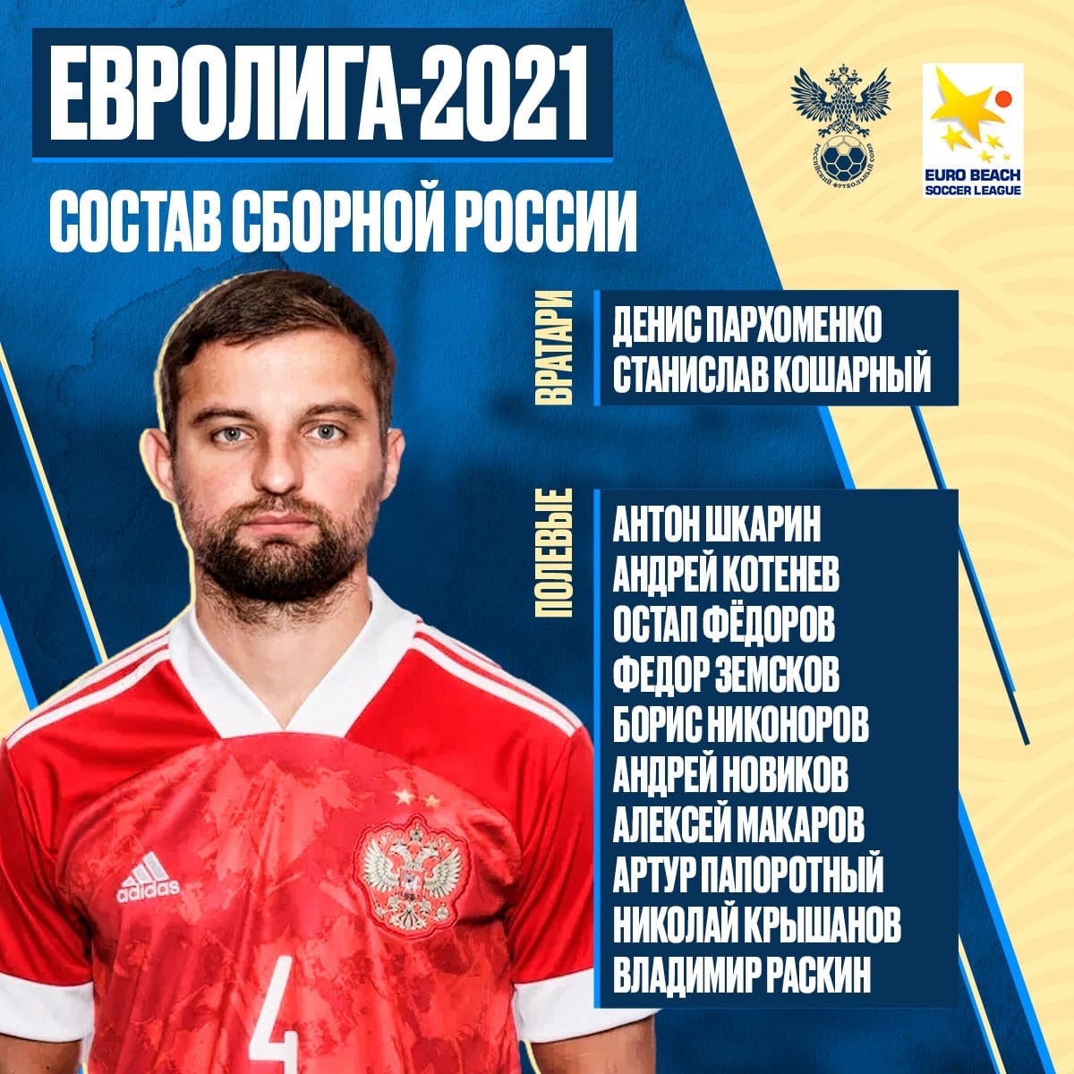 Сегодня Тренерский штаб сборной России объявил состав на Суперфинал Евролиги, который пройдёт с 9 по 12 сентября. На групповой стадии наши парни встретятся со сборными Польши, Белоруссии и Испании. По сравнению с чемпионатом мира в составе 3 изменения. Как я и предполагал ранее, в состав не вошли: вратарь Максим Чужков, полевые Юрий Крашенинников и Дмитрий Шишин. Зато мы увидели два новых лица, Николай Крышанов и Владимир Раскин. Давайте знакомиться. На самом деле этих ребят не знают те, кто за пляжным футболом начал следить с чемпионата мира в этом году. Николай Крышанову уже 32 года, молодым его никак не назовёшь. В сборной он уже выступает давно. А именно с 2016 года, 45 матчей и 17 голов. Николай это опытный забивной нападающий. Крышанов за свою карьеру поиграл в Локомотиве и Спартаке, а сейчас выступает за саратовскую Дельту. Судя по антропометрий и голевому чутью призван заменить Дмитрия Шишина. Владимир Раскин будет одним из самых молодых в составе нашей сборной, ему 25 лет. Не