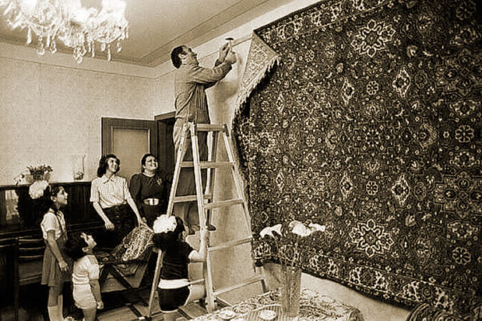 Здравствуйте, дорогие читатели! Новые задания уже ждут вас, и сегодня мы поговорим с вами о традициях отмечать Новой Год, вспомним о советском кино и спорте, поизучаем занимательный предмет из прошлого, не забудем и автопром той эпохи, вдохнем ароматы прошлого, ну и, конечно же, не забудем про политику. Наверное, многие из вас, глядя на это фото, тоже, вспомнили свою квартиру, в которой выросли. Приобретение ковра в советское время было делом почти что обязательным. Именно вот также, на деревянную планку вешали ковер и в нашем доме. Покупка нового большого ковра была целым событием. Отец занимался подготовкой стены, а мама пришивала колечки к ковру, на которые потом он и водружался. В моде были крупные ковры, чтобы висел почти на всю стену. Как правило, рядом ставился диван так, чтобы ковер оказывался за его спинкой. Вот точно такой же ковер висел у нас в квартире, сочно красного цвета с рисунком. Помню, когда его только повесили, я незаметно от всех проводил пальцем по его ворсу, мне