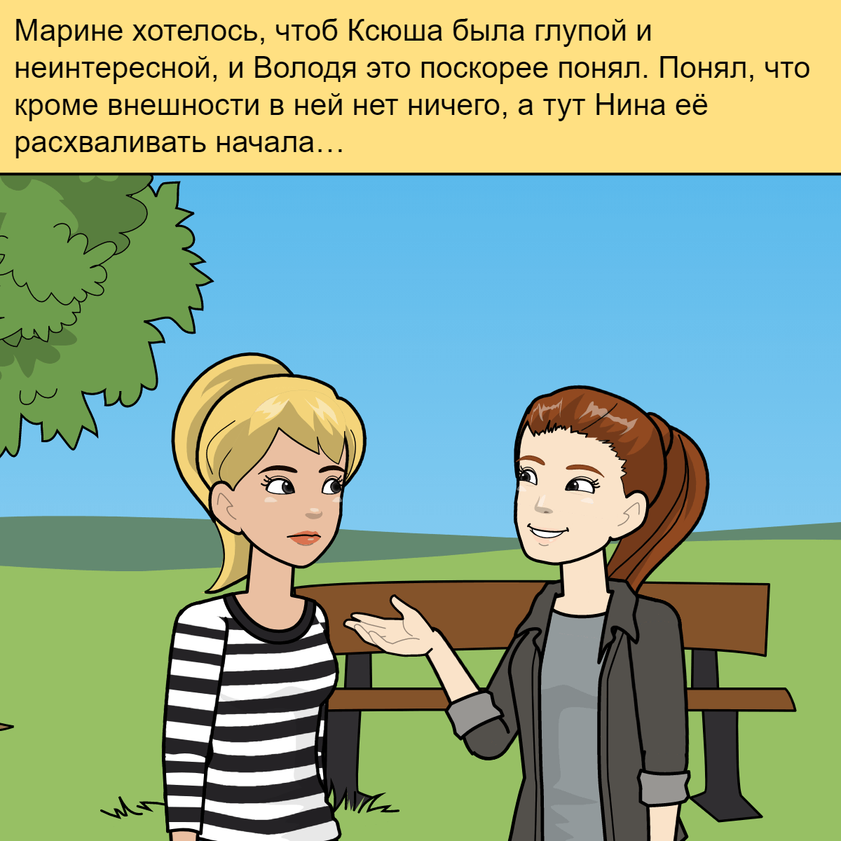 Содержание рассказа. Сергей за ужином был какой-то странный. Говорил мало. Весь в своих мыслях. Марина этому была только рада, так как сама тоже была полностью в своих мыслях. Он не спросил, что Марина собирается делать после ужина и сам ничего не предложил. У Марины и Нины оставался час чтоб собраться и отправиться «на дело». Марина посему-то волновалась. Но очень была рада, что с ней идёт Нина и они не останутся с Володей наедине. Марина оделась поудобнее. Шорты и футболку. Волосы собрала в высокий хвост и вышла на улицу. Нина уже сидела на лавочке между номерами их и Володи. -Уже ждёшь? – Марина -Да, Ксюша занимается английским по скайпу, я решила не мешать, а то маячу там перед камерой. -ООО! Какая Молодец – Марина (ехидно) -Ей нравится. Она не такая уж и тупая как мне показалось в первый момент – Нина -Возможно, но общаться с ней у меня желания почему-то нету – Марина -Ну ты прям совсем как-то жестоко к ней. Она своеобразная, но собеседник интересный. Точно не дура. Она много знае