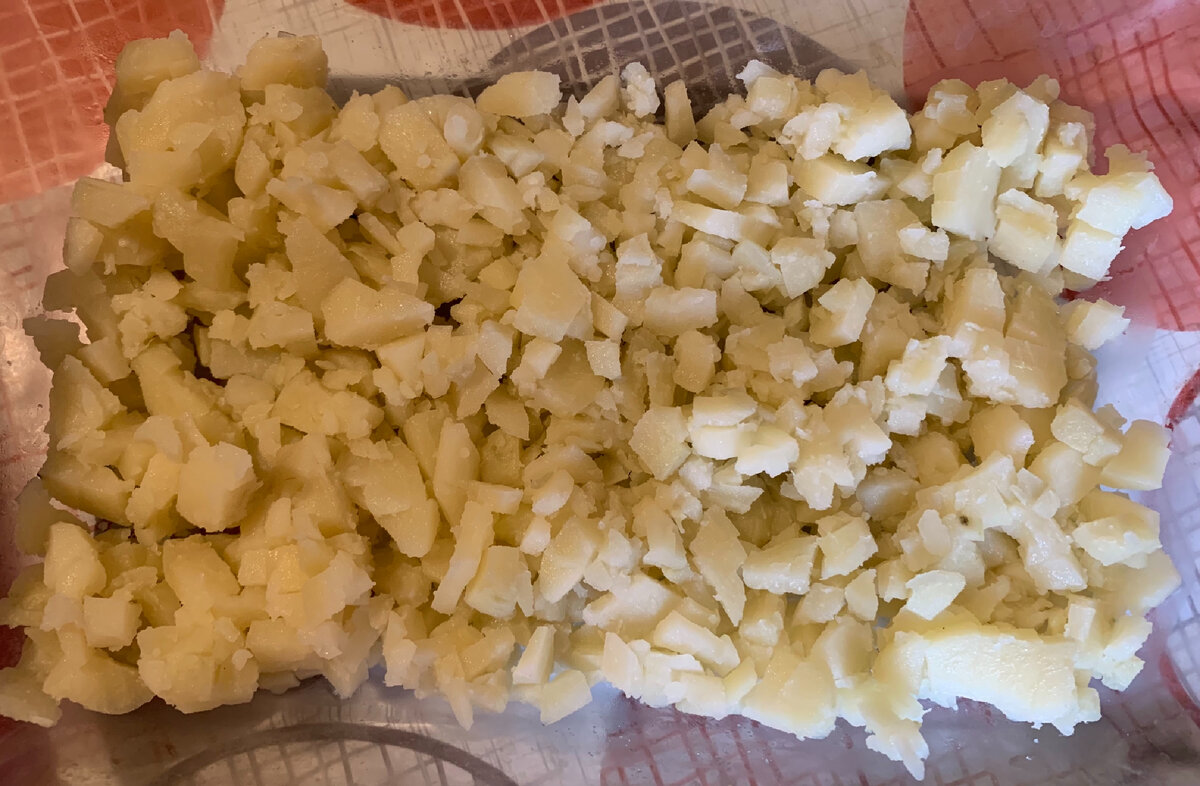 В продолжение темы про Рецепты из голодных 90-х вспомнился мне один очень интересный вариант. «Селедка под шубой» но без селедки) Вот это задачка!) Я очень хорошо помню меню новогоднего стола тех лет: Остальные изыски в основном состояли из какого то алкоголя, в силу возраста мне тогда совершенно неинтересного. И всевозможных солений - варений. Так вот тему то я вспомнила не просто так) начала готовить сегодня эту самую Селедку под шубой и вспомнила рецепт того времени, который выручал нашу семью ничуть не меньше, чем Суп с фрикадельками. И самое главное в этом рецепте удавалось обойтись без селедки) Предвосхищая восторженные отзывы комментаторов) скажу, что фото в статье буду того салата, который я готовлю СЕЙЧАС. И попутно буду рассказывать про старый рецепт. Итак. Первым слоем у нас идёт картошка. И я ее не натираю, а нарезаю мелким кубиком. Кстати, немногие так делают. А для меня это идеальный вариант. В таком виде вкус картошки немного ярче. По структуре она в салате