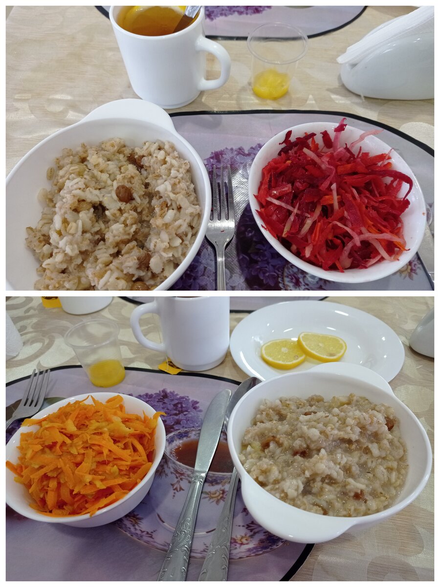 Питание при очищении организма в медицинских учреждениях обычно назначается в зависимости от индивидуальных особенностей организма человека. В медицинском центре, где я прохожу детокс, используется методика очищения организма С. М. Гусиной, профессора из Санкт-Петербурга. По этой методике мне назначили особую безбелковую и безсолевую диету. Вот как она выглядит на примере двух дней. Завтрак: Каждый день каша из цельнозерновой овсянной крупы с фруктами (изюм, банан...) и чай с лимоном и медом. Первый день: салат овощной из свежих овощей: капуста, перец, свекла. Второй день; салат из моркови и яблока с добавлением лимонного сока и немного растительного масла. Обед: Каждый день: салат овощной из свежих овощей. Первый день: овощной суп ( спаржа, цветная капуста, морковь, зелень) со сметаной и свекольные котлеты. Второй день: свекольник и морковные котлеты с листьями салата и сметаной. На обед всегда много зелени, и обязательно зубчик чеснока. Ужин: Каждый день: овощной салат из свежих ов