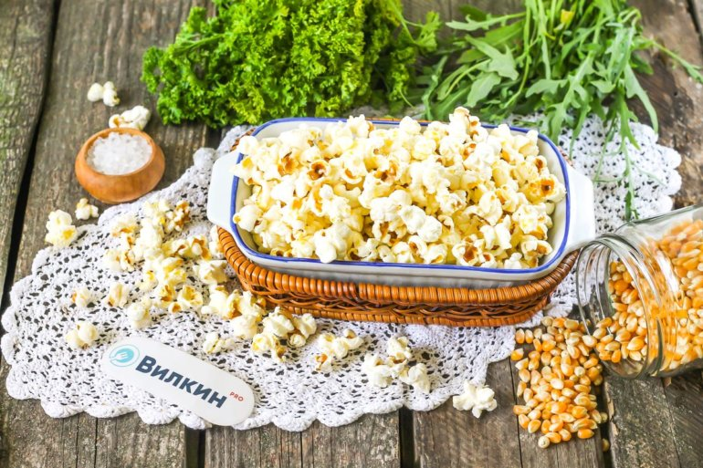 Ингредиенты на 2 персоны Зерна кукурузы - 80 гр. Соль - 0.5 ч.л. Масло растительное - 1.5 ст.л. Шаг 1 из 7 Подготовьте необходимые продукты. Приобрести специальные зерна кукурузы можно в любом супермаркете на развес или на рынке. Шаг 2 из 7 Кукурузные зерна нельзя долго прогревать, иначе они могут пережариться. Поэтому сначала прогрейте саму сковороду, поместив ее на плиту и включив максимальный нагрев. Используйте чугунную посуду, если таковая есть. Как только она основательно прогреется, убавьте нагрев до среднего и влейте растительное масло, всыпьте соль. По желанию попкорн можно присолить и после приготовления, но в процессе жарки он станет более однородно соленым. Шаг 3 из 7 Сразу же высыпьте зерна кукурузы. Ни в коем случае не промывайте их! Единственное, что вы можете сделать для их очистки – это перетереть зерна между ладоней, удаляя лишние чешуйки и пыль. Шаг 4 из 7 Затем моментально накройте емкость крышкой и жарьте их на среднем нагреве. Примерно через 1-2 минуты зерна нач