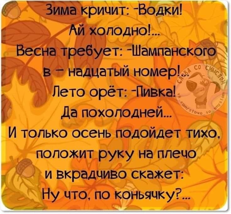 Знаешь, как осень приходит? Молчанием... Просыпаешься в самую рань – а кругом такая тишина, словно отключили звук. Только ветер шумит. Лежишь с закрытыми глазами, зарывшись носом в кусачее шерстяное одеяло, и слушаешь молчание осени... Осенью все чувства обостряются! Мелочи кажутся более значимыми. День, кажется, полон чем-то непостижимо загадочным, хоть и становится все короче и короче, а воздух все холоднее и холоднее. И тепло осени именно в этой загадочности, в преображении, когда каждый погружается в себя, книги, фильмы, друзей в поисках тепла и уюта, чтобы зимой не замерзнуть. Красоту осени каждый по-своему видит… Как ни странно, но осень для меня пахнет теплом, теплом домашнего очага, уютом. Осенью все чаще хочется быть дома, наслаждаться общением с родными и близкими за чашкой ароматного, пряного чая. Осень пахнет мамиными заготовками на зиму - домашним рагу, вишневым вареньем, яблочным джемом. Осень пахнет теплой одеждой, которую мы достаем из шкафов и антресолей. Осень пахнет