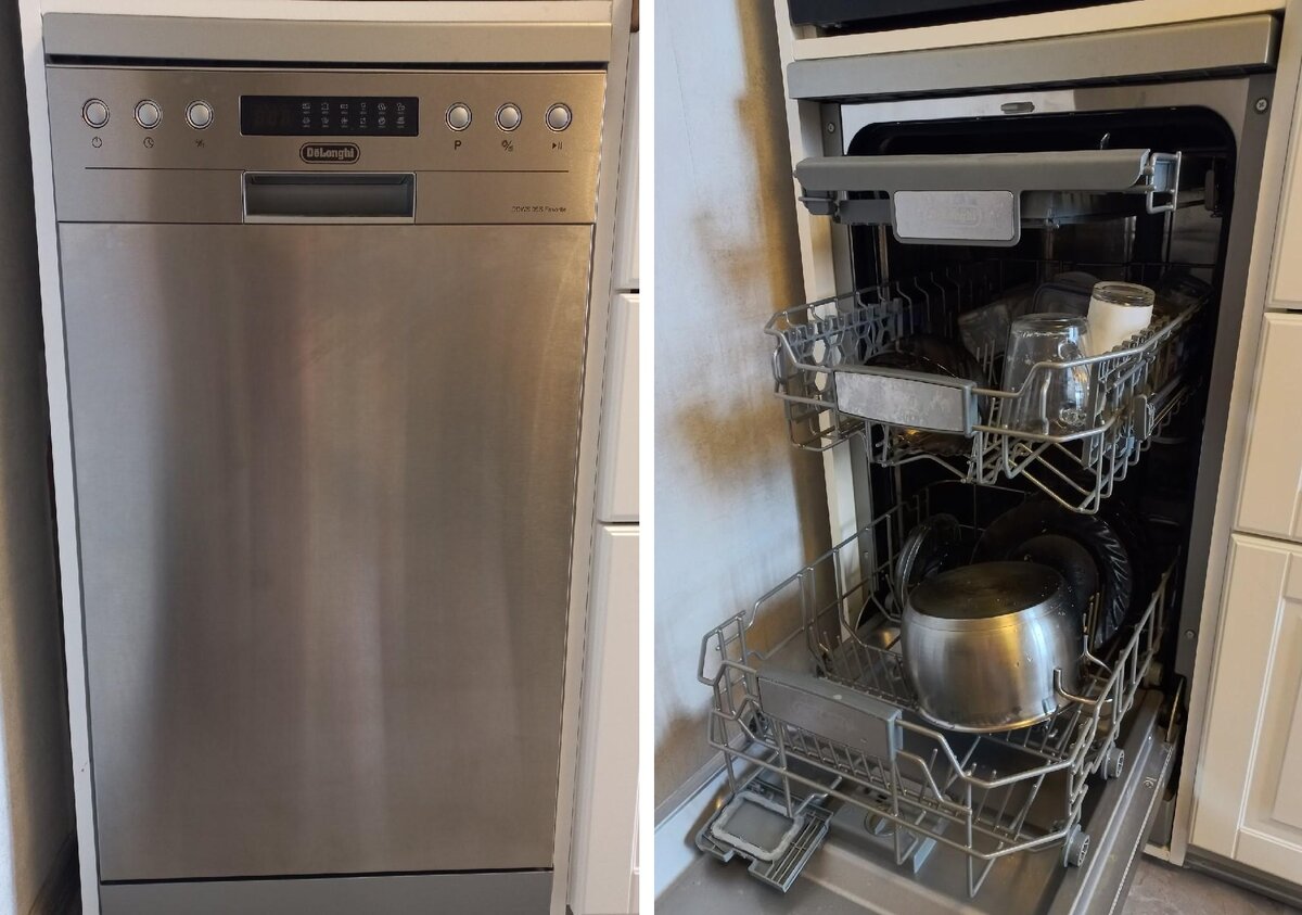 Не помещается ничего на кухне, а мыть посуду все равно хотелось бы не своими руками. Поэтому в мире кухонной техники появилась вот такая замечательная узкая Посудомоечная машина DeLonghi DDWS09S Favorite, о которой хочется рассказать. Ширина ее составляет всего 45 см. Габариты у посудомойки шикарные, внутри она больше, чем кажется снаружи. Помещается аж 10 комплектов посуды. Вторая корзина регулируется по высоте, это очень удобно. Подключать, если следовать схеме, не сложно. Ручка открывания и "фасад" управления смотрятся шикарно, ничего лишнего. Звуковой сигнал не противный и не слишком громкий. Подсветка тоже глаз не режет. Имеется дозатор (с индикатором) ополаскивателя и дозатор моечного средства. Тут все стандартно. Посудомойка имеет 6 программ, расход воды 8 литров. Имеется таймер отсрочки запуска и защита от детей. Такой хороший середнячок. На рынке, при кажущимся разнообразии, узких машин не много. Из минусов можно отметить, что корпус из нержавейки цвета серого металлика. Это к