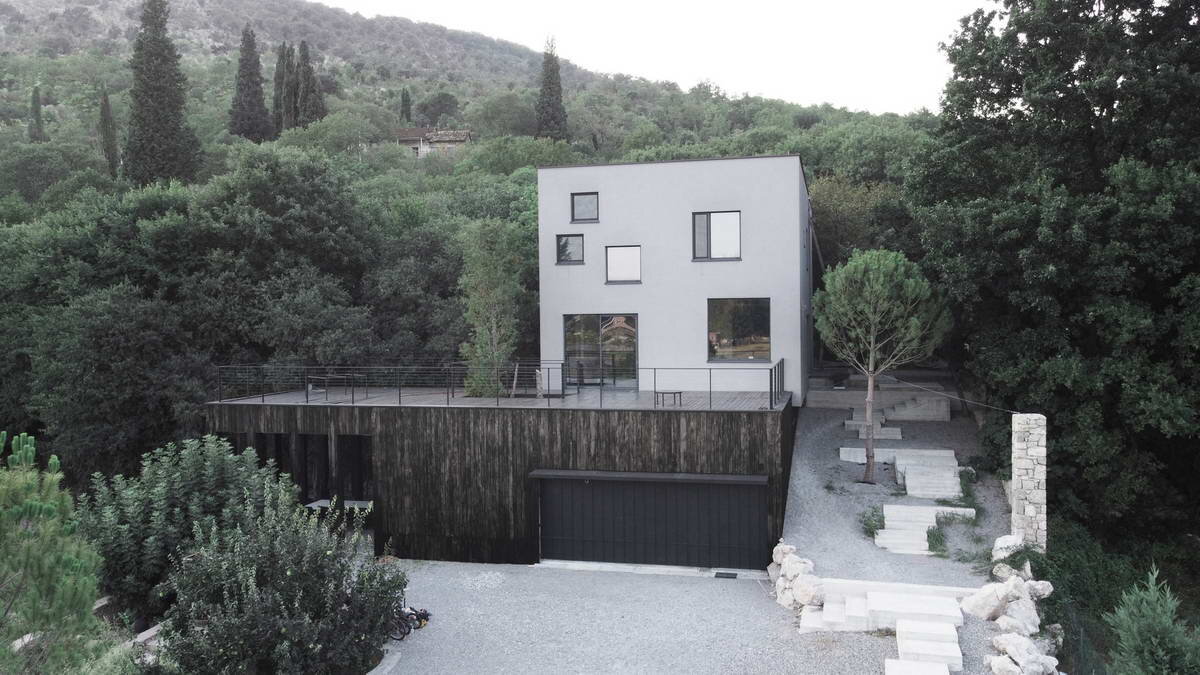 Резиденция построена в пригороде Подгорицы в Черногории. Ориентация здания использует наклон местности и придаёт равную ценность видам на деревья и окружающую природу. В качестве дизайнерской стратегии авторы предложили объёмную кубическую композицию. Отношения между внутренним и внешним пространством основаны на обеспечении как можно большего количества естественного света через отверстия разного размера на фасаде. На верхнем уровне вы найдете спальни и общие зоны, а на нижнем уровне — гостиную с кухней и столовой. Самый нижний уровень здания отведен под гостевую зону, услуги и автостоянку. Зоны нижнего уровня объединены с террасой, образуя место для собраний. Позади виллы находится бассейн, вписанный в скалистый холм и лес. Название: Вилла Б (Villa B)