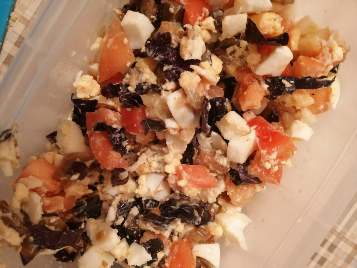 Понадобится: 1. Помидор = 2 шт. небольшие. 2. Яйца вареные = 2 шт. 3. Баклажан = 1 шт. средний. 4. Базилик свежий = 3 листочка. 5. Чеснок = 1 зубчик. 6. Соль, перец = по вкусу. 7. Растительное масло = для жарки. 8. Майонез = для заправки. Приготовление: 1. Баклажаны нарезаем кубиками, солим и оставляем на 30 минут, чтобы вышла горечь.Затем обжариваем их на масле до золотистой корочки. 2. Помидоры и яйца нарезаем кубиками. 3. Добавляем выдавленный чеснок, солим, перчим. 4. Нарезаем базилик, можно добавить петрушку. 5. Заправляем майонезом и вкуснятина готова. #приятного аппетита#