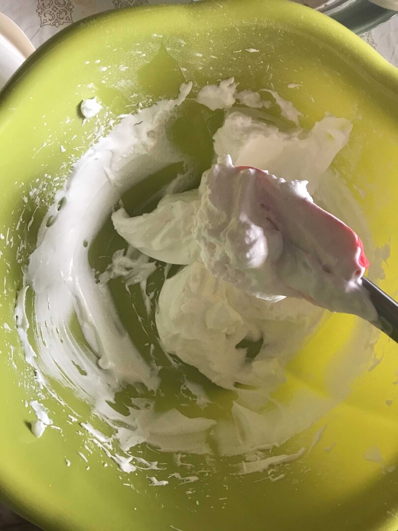 1. Взбиваем белок яиц в пышную пену, чтобы масса держалась на венчиках и на силиконовой лопатке! 2. Далее порционно вводим сахар, яблочный уксус, кукурузный крахмал, продолжаем взбивать.