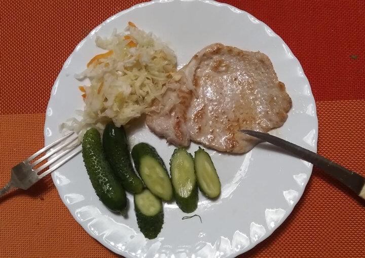 Когда я выкладывала рецепт супа "Том-ям", меня попрекнули: "ой, охота людям так заморачиваться с едой! Сварили бы лучше борщ!" Я прислушалась к совету, и даже с борщом заморачиваться не стала. Тем более, что в борще свёкла. Итак ужин из серии "вообще не заморочилась". Отбивная (да, я ем свинину и мне нормально), квашеная, ещё "летняя", капуста (немного наквасила, она не хранится долго и вкус попроще, чем у "зимней"), малосольные (мало-мало) огурчики. Ну и чашка чая "без никто", которая в кадр не вошла. Приятного аппетита! Больше общения и рецептов - в группе "Жизнь с диабетом" в Facebook! Рецепт на странице в Facebook Автор рецепта - Юлиана Виноградова