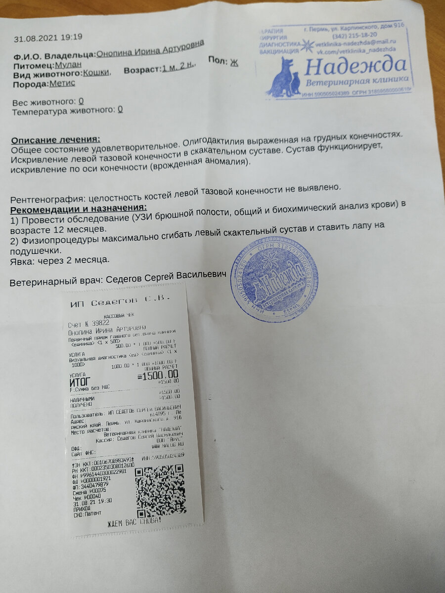 г.Пермь На приеме у травматолога я узнала много интересного, пополнила свой словарный запас еще одни умным словом и обогатила опыт. Многие из Вас слышали о таком заболевании как полидактилия (количество пальчиков на лапах больше, чем положено). Есть противоположное заболевание, называется оно олигодактилия. Никогда о нём раньше не слышала. Перерыла интернет, информации на столько мало, что без помощи ветеринара здесь никак. Олигодактилия влечет не только генетическое уродство, это пол беды, самое страшное - проблемы с почками. Именно проблемами с почками опасно данное заболевание. Уже с раннего возраста (с 1 года) необходимо пройти первое обследование (УЗИ, биохимия). Регулярно мониторить здоровье, чтобы не упустить болезнь почек. Строгий контроль, своевременное лечение и качественное питание, вот что поможет прожить таким животным много лет. Малышка Мулан, как я и подозревала, ее лапа имеет искривление генетического характера, а не травмы. Пока она маленькая нужно разминать лапку,