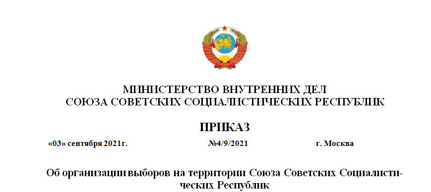 4. В коллективах Министерства внутренних дел СССР с 01.09.2021 года по 01.10.2021 года провести собрания с целью выдвижения кандидатов в Советы народных депутатов - Верховный Совет СССР, Верховные Советы союзных республик, Верховные Советы автономных республик, краевые, областные Советы народных депутатов, Советы народных депутатов автономных областей и автономных округов, районные, городские, районные в городах, поселковые и сельские Советы народных депутатов согласно административно-территориального деления, закрепленного в Конституции (Основном Законе) СССР 1977 года без изменений и Конституций (Основных Законов) Союзных республик СССР. Квота по выборам от 100 000 граждан - 1 кандидат в депутаты Верховного Совета СССР/РСФСР. Сроки выдвижения кандидатов определены с 01.09.2021 года по 01.10.2021 года.