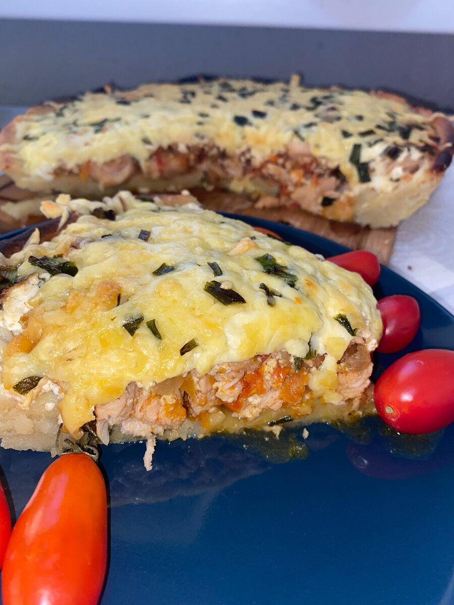 Сегодня хочу с вами поделиться пирогом на очень интересном картофельном тесте. который оказался очень вкусным и сочным. Пирог не меняет своего вкуса даже в холодном виде. Итак для пирога нам понадобится: Для теста: 1. Картофель- 300 гр 2. Сливочное масло- 100 гр 3. Яйцо- 1 крупное или 2 небольших 4. Соль- 1 ч.л 5. Мука- 200 гр Картофель очистить порезать небольшими кубиками, отварить, слить воду, растолочь в пюре, дать немного остыть добавить масло, яйцо, соль, перемешать, затем аккуратно вмешать муку. Тесто получается достаточно мягкое так что не пугайтесь. Готовое тесто необходимо завернуть в пищевую пленку или пакет и отправить отдыхать в холодильник на 30 минут. Начинка для пирога: 1. Филе куриное- 500гр 2. Лук- 1 большую головку или 2 маленькие 3. Помидор- 2 средних ( я использовала черри) 4. Томатная паста- у меня 30г Соль по вкусу Так же я использовала болгарский перец и морковь но они у меня были замороженные Заливка для нашего пирога: 1. Сметана-150гр 2. Молоко-150гр