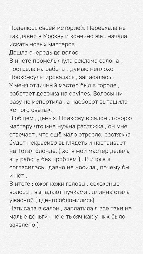 Предыстория. Есть такая блогерша, Алёна Погребняк. Канал у нее о косметике и макияже. У нее есть рубрика, где она ходит по трешовым салонам и снимает на видео, как её красят. У неё есть телеграм-канал, где ее подписчицы скидывают свои печальные истории после посещения салонов и мастеров. Одна из таких приехала в Москву. Пришла в салон. Ей сделали не то, что она хотела. Как итог: ожог кожи головы. Кожа вся красная, волосы "благополучно", как она выразилась, повыпадали... Меня поразило, что она пишет "Я не скандальный человек, не стала тратить нервы". Просто занавес... Тебе кожу головы сожгли, практически без волос оставили, и ты тоже решила оставить это всё без разбирательств.