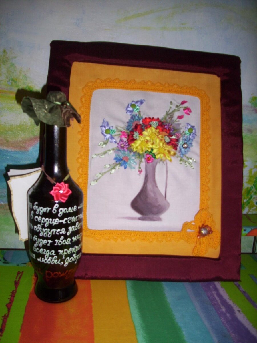 Мой вариант декора бутылки и вышитая картина в подарок.