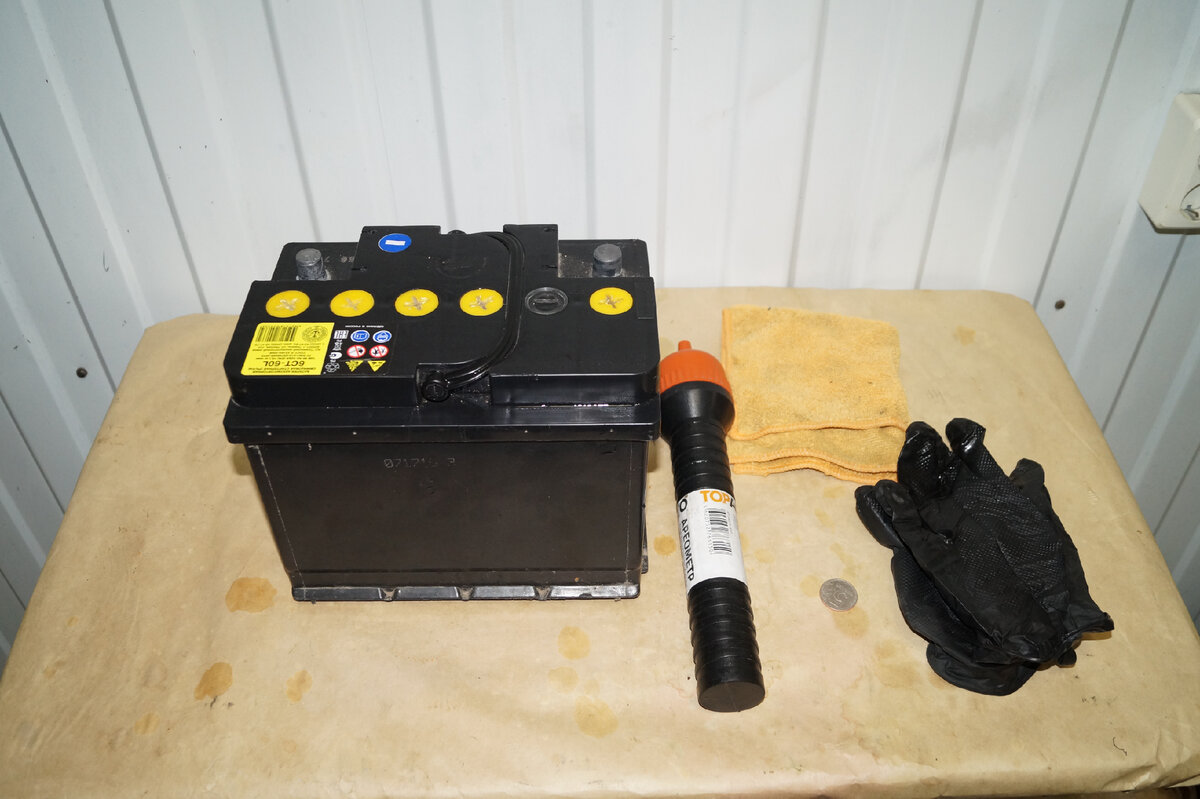 Приветствую друзья! В данной публикации расскажу как правильно измерить плотность электролита в обслуживаемой аккумуляторной батарее. Для чего это нужно? Отвечаю: АКБ с низкой плотностью электролита не только плохо держит заряд, но и замёрзнет при минусовой температуре. К примеру, АКБ с плотностью электролита 1,15г/см3 замёрзнет уже при -16 С. А как следствие танцы с бубном на морозе вокруг автомобиля гарантированы! Дабы не оказаться в такой ситуации готовим сани с лета. Так что перед холодами обслужить АКБ лишним не будет. Очень важно! Прежде чем приступать к измерительным работам необходимо соблюсти два основных критерия: Приступаем! Для измерения плотности электролита нам понадобится: Чистой тряпкой протираем поверхность в районе пробок. Далее пятирублёвой монетой откручиваем все пробки, так как измерять плотность электролита необходимо в каждой банке. Когда все пробки выкручены смотрим на уровень электролита в банках, он должен быть выше уровня свинцовых пластин, примерно, на 10-