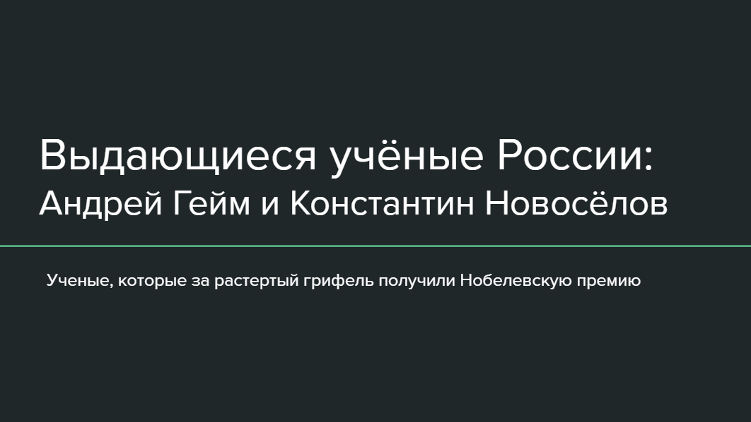 Презентация на тему выдающиеся ученые России. В этой презентации мы познакомим вас с учеными современности - Андреем Геймом и Константином Новосёловым Скачать презентацию Скриншоты из презентации: Презентация расчитана на подростков, сделана в более смешном виде, с большим количеством анимаций и разных изображений. В презентации 18 слайдов, с учетом титульного слайда, и слайда с прощанием. Презентация рассказывает о двух учёных: Андрее Гейме и Константине Новоселове, и о их вкладе в науку - о веществе под названием Графен. Скачать презентацию Как скачать презентацию? Переходим по ссылке на google диск. Под названием файла будет раздел "файл" - нажимаем на него. И в разделах "Файл" ищем "скачать" и далее выбираем формат который нам нужен, и скачиваем.