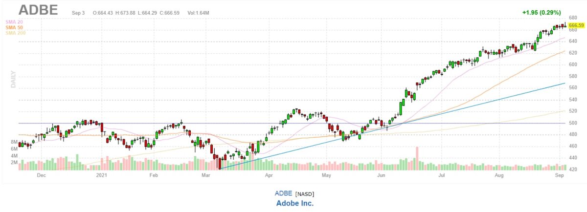 Стабильный подъем в бумагах Adobe стартовал в начале июня и за эти три месяца ни разу не был прерван сколько-нибудь серьезной коррекцией. Акции обновляют свои исторические максимумы в среднем два раза в неделю. Капитализация компании на днях перевалила за отметку $300 млрд, что немногим дешевле Disney. Сейчас акции Adobe на 56% выше своего годового минимума. Фундаментально в пользу Adobe сейчас играет несколько факторов: 1️⃣ органический рост облачного бизнеса, 2️⃣ отсутствие значимых конкурентов в нише ПО для графического дизайна 3️⃣ поддержка со стороны хедж-фондов. Более 100 топовых портфельных управляющих держит сейчас бумаги Adobe. Мультипликаторы. Обычно завышенный P/Е служит сильным негативным сигналом для фондов и розничных инвесторов. Но в данном случае это не работает. По соотношению цена/прибыль бумаги #Adobe сейчас стоят почти 57. Форвардный P/E дает 47 единиц, но это все равно много: на уровне таких «горячих» бумаг, как Paypal, и лишь немного ниже, чем у Amazon. Ка