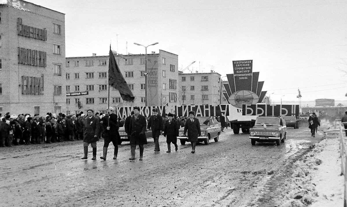 Всем хорошо известно, что первые КАМАЗы были спроектированы и произведены в Москве на заводе имени Лихачёва (ЗИЛ). Когда еще только строился Камский автозавод, один из экспериментальных образцов автомобиля КАМАЗа побывал в Набережных Челнах и принял участие в демонстрации, посвящённой 54 годовщине Великого Октября. Чтобы показать машину строителям КАМАЗа, Шведов Иван Иванович - водитель-испытатель ЗИЛа, проделал большой путь. Предлагаю вам посмотреть фотографии с ноябрьской демонстрации 1971 года. Обратите внимание на трибуну. Она ещё деревянная. Пройдёт время, и в ноябре 1972 года (по другим данным - 1 мая 1973 года) руководители города и партии, директора предприятий и начальники организаций будут приветствовать колонны трудящихся уже с новой каменной трибуны. Ещё год назад, 7 ноября 1970 года по улице Гидростроителей ехали сани. и вот 7 ноября 1971 года строители КАМАЗА и Набережных Челнов увидели своими глазами, ради чего они месят сапогами грязь и испытывают бытовые трудности… Во