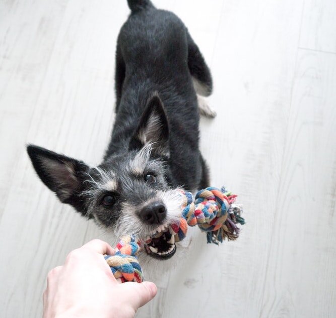 Лучший метод наладить контакт с собакой и обучить ее чему-то – это играть. Играть целенаправленно, увлеченно, устанавливая правила и получая искреннее удовольствие от всего процесса. Игра – это простейший механизм обучения и упрочнения социальных связей у стайных животных. Благодаря дружбе с человеком, домашняя собака сохраняет инфантильное «полущенячье» поведение всю свою жизнь, будучи всегда готовой к веселой игре и приключениям. Мы подготовили пять простых и понятных игр, в ходе которых вы сможете не только развлечь собаку и себя, но и развить врожденные инстинкты и закрепить нужные навыки. Игра в мяч – любимая у большинства собак. В ней пес одновременно реализует несколько естественных форм поведения хищника: Вы удивитесь – где же в апортировке можно найти борьбу? Попробуйте заменить обычный резиновый мячик на игрушку с пищалкой или пластиковую бутылку, грохочущую при смятии. Звуки, которые «добыча» издает при поимке и будут явным свидетельством сопротивления для собаки. А значит –