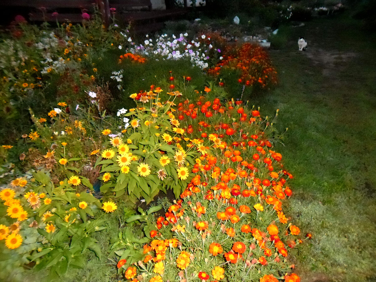 Сейчас все меньше времени остается на цветы, надо убрать огород, а с цветочками только здороваешься утром, да вечером прогуляешься и вас я приглашаю на вечернюю прогулку вместе со мной ! На улице очень холодно, а ночью так вообще до + 1 опускается , сегодня наверное был первый заморозок, но цветочки все живые, хотя их все меньше остается в саду , в основном бархатцы, они везде, но сколько красок они вносят в осенний сад ! Бархатцы, бархатцы, кругом они ! Когда я уберу их, на этом месте сделаю клумбу полукругом из лилейников, в середину посажу лилии с флоксами, добавлю рудбекию, я уже вижу эту клумбу !Прям полыхают на закате ! Прям полыхают на закате ) Цветет рудбекия, эти желтые солнышки , яркое пятно в осеннем саду ) Еще цветет эхинацея, рядом с дереном белым ) А это кустик мяты, напоминает жвачку дирол, или наоборот ) Мои петунии, если бы к красно- белым добавить синий, получился бы Российский флаг ) Астры и декоративная