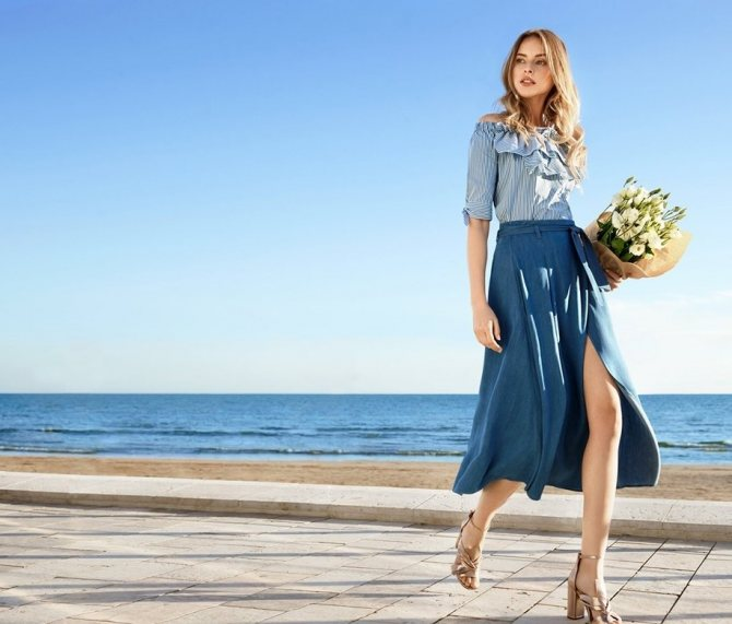 Самой универсальной длиной остается миди, когда юбка заканчивается сразу под коленом или в самой узкой части голени. Юбка А-силуэта также является максимально универсальной для любой фигуры.