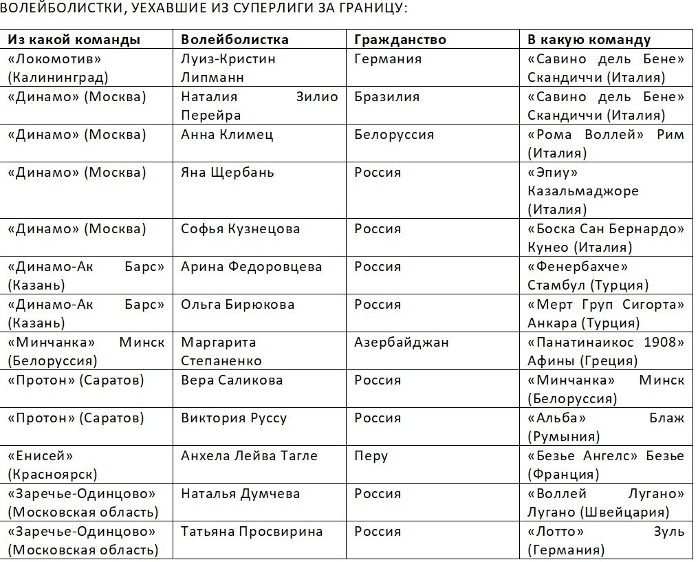 Теперь о второй группе переходов, о тех игроках, что решили довольно круто изменить свою жизнь, и из числа запасных прошлого сезона стать легионерами в иностранных командах. Я этим волейболисткам аплодирую стоя за смелость, поскольку такой шаг подчёркивает их стремление развиваться в спортивном смысле, тем более что место в составе в новых командах им тоже никто не гарантирует.